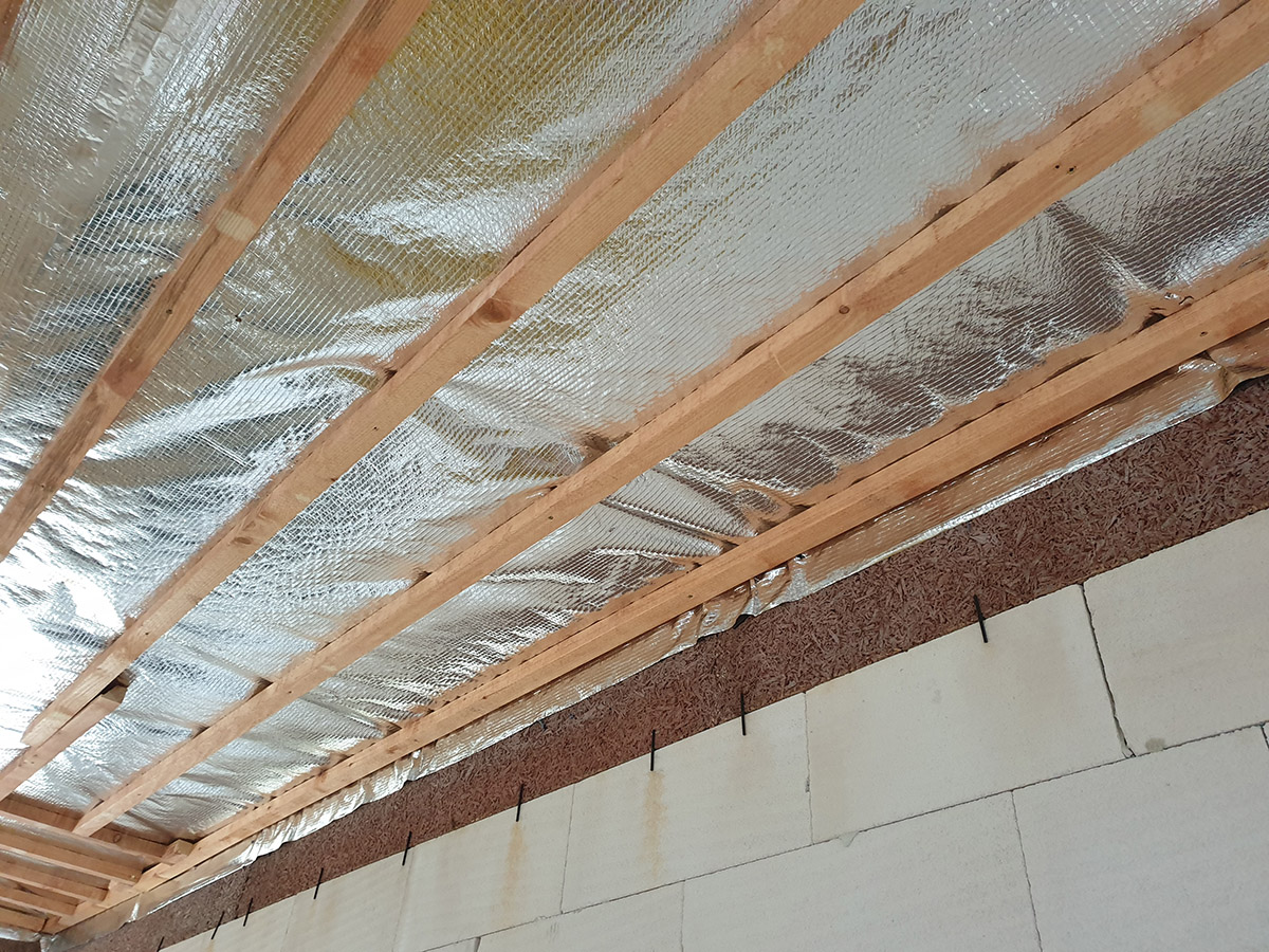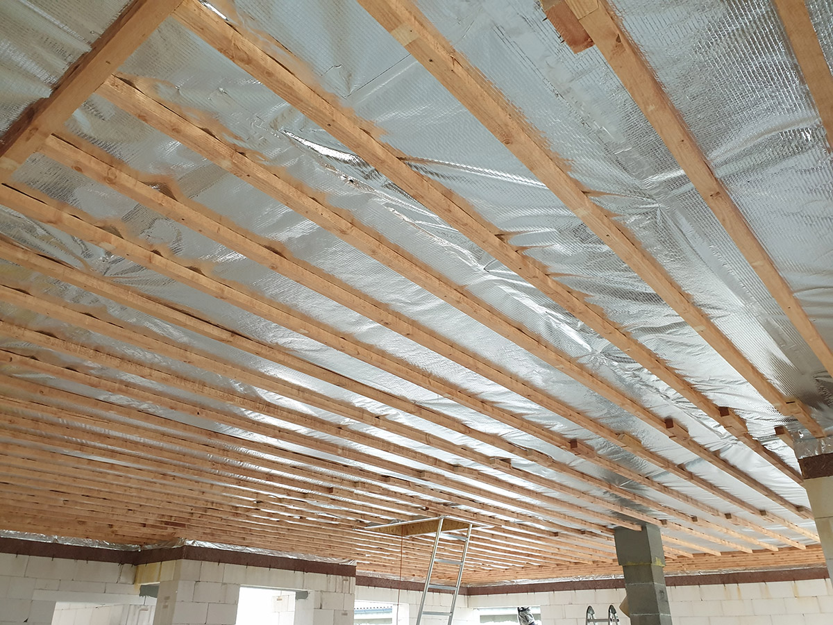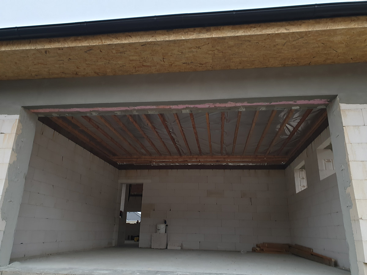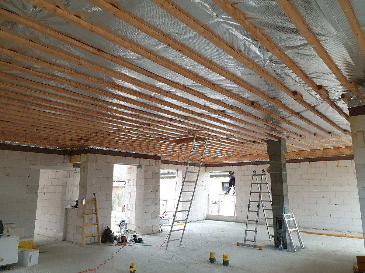 A tetőtér szigetelése érdekében fújható szigeteléssel el kell végezni a szükséges építési előkészületeket. Közvetlenül a rácsos tartó alsó sávjába horgonyozzuk az AL párazáró fóliát és a rácsos tartó elhelyezésének irányához képest keresztirányba ezt a fóliát tetőlécek rendszere segítségével fogatjuk le. A párazáró fólia rögzített kötéseit speciális AL szalaggal biztosítjuk. A falaknál az AL párazáró fólia, amelyre ezután a fújható szigetelés kerül (pld. STEICO Zell – farost szigetelés), speciális gitt segítségével, a falhoz lesz horgonyozva. Szükséges, hogy az előkészületi munkák során tökéletesen meg legyen oldva az összes szükséges részlet. A tetőlécekre ezek után kerül rögzítésre a tetőszerkezet gipszkarton rendszere. Az AL párazáró és a tetőszerkezet gipszkarton rendszere között létrejön a szerelési rés, ahol az elektromos kábeleket vagy egyéb szükséges szereléseket lehet vezetni, mint pld. a légtechnika, amely biztosítja, hogy az AL párazáró fólia ne perforálódjon túlzottan, vagy egyéb módon ne károsodjon. Ez az épület hőfizikai jellemzőinek tökéletes és hosszú távú biztosítása érdekében szükséges. A fújható szigetelés alkalmazása érdekében elvégzett előkészületek egyéb módjai is ismertek, viszont ez a módszer biztosítja az épület szükséges magas minőségi színvonalát és működőképességét az épület magas minőségi színvonalának és használatának hosszú távon történő megtartása mellett.