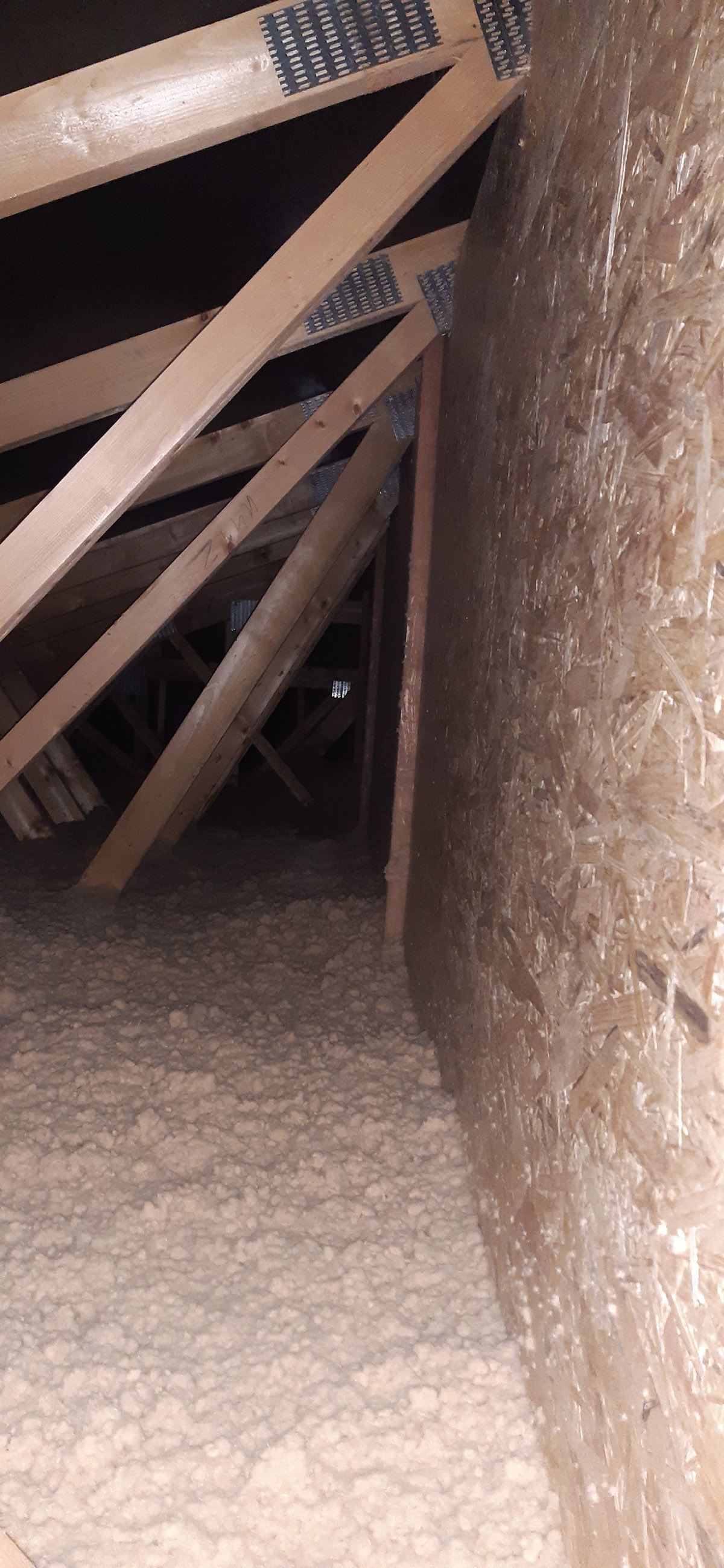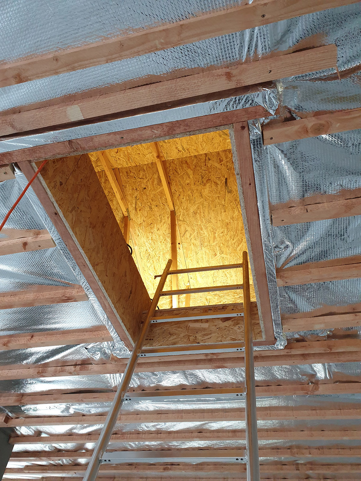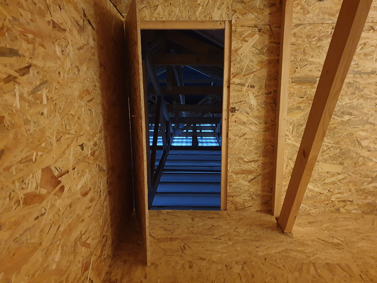 A tetőtér szigetelése érdekében fújható szigeteléssel el kell végezni a szükséges építési előkészületeket. Közvetlenül a rácsos tartó alsó sávjába horgonyozzuk az AL párazáró fóliát és a rácsos tartó elhelyezésének irányához képest keresztirányba ezt a fóliát tetőlécek rendszere segítségével fogatjuk le. A párazáró fólia rögzített kötéseit speciális AL szalaggal biztosítjuk. A falaknál az AL párazáró fólia, amelyre ezután a fújható szigetelés kerül (pld. STEICO Zell – farost szigetelés), speciális gitt segítségével, a falhoz lesz horgonyozva. Szükséges, hogy az előkészületi munkák során tökéletesen meg legyen oldva az összes szükséges részlet. A tetőlécekre ezek után kerül rögzítésre a tetőszerkezet gipszkarton rendszere. Az AL párazáró és a tetőszerkezet gipszkarton rendszere között létrejön a szerelési rés, ahol az elektromos kábeleket vagy egyéb szükséges szereléseket lehet vezetni, mint pld. a légtechnika, amely biztosítja, hogy az AL párazáró fólia ne perforálódjon túlzottan, vagy egyéb módon ne károsodjon. Ez az épület hőfizikai jellemzőinek tökéletes és hosszú távú biztosítása érdekében szükséges. A fújható szigetelés alkalmazása érdekében elvégzett előkészületek egyéb módjai is ismertek, viszont ez a módszer biztosítja az épület szükséges magas minőségi színvonalát és működőképességét az épület magas minőségi színvonalának és használatának hosszú távon történő megtartása mellett.
